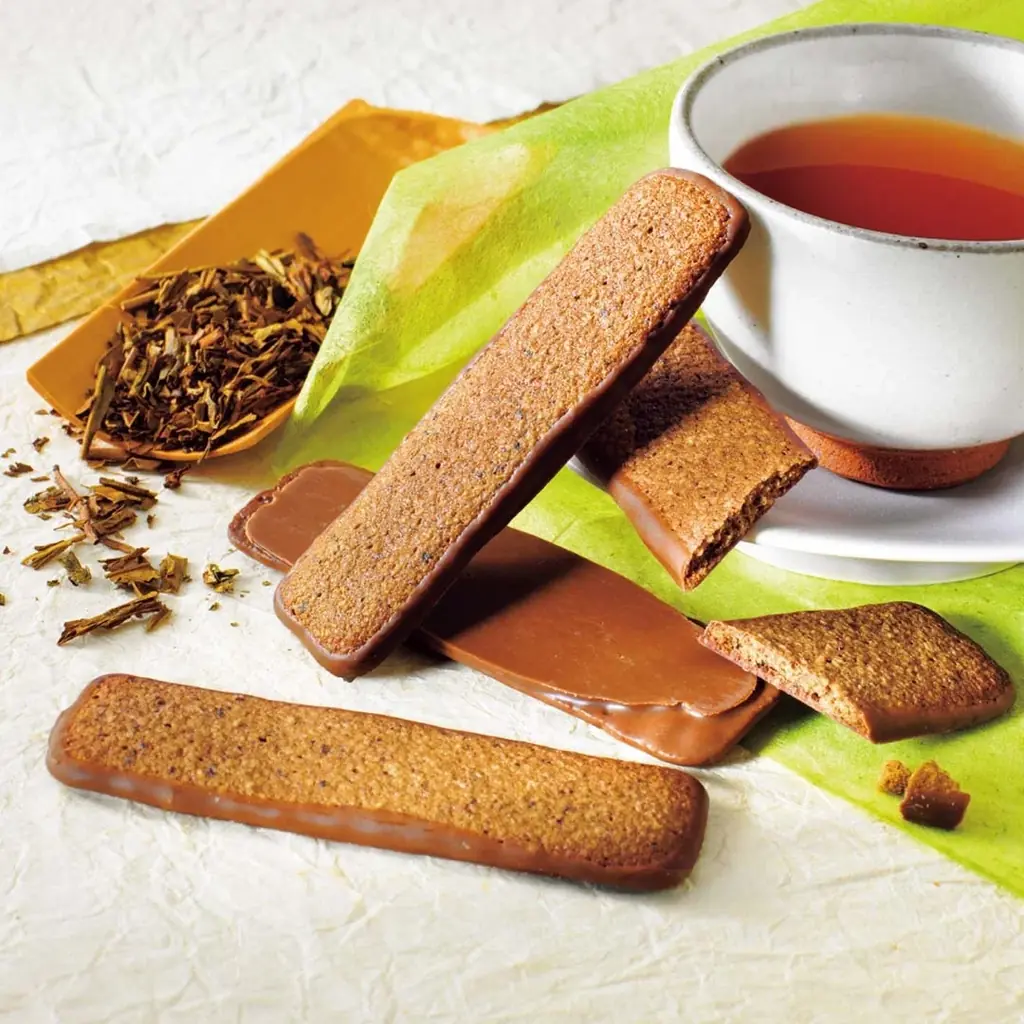 京都府産宇治ほうじ茶を使ったミルクチョコレートを、ほうじ茶風味のクッキー片面にコーティングした商品。2種類のほうじ茶を使い分けることで力強いほうじ茶感を出し、オレンジゼストとバナナパウダーを隠し味に用いて香りとコクを引き立てています。