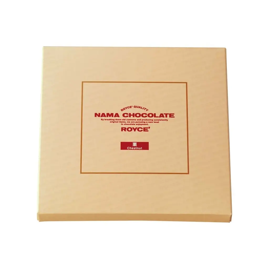 ミルクチョコレートにマロンパウダーをブレンドし、栗の味わいをダイレクトに感じられる生チョコレートです。まろやかなコクのある栗の風味がミルクチョコレートによって洗練された味わいとなり、隠し味としてラム酒とブランデーの2種類の洋酒が使用されています。酒類の風味が栗の余韻を引き立てます。