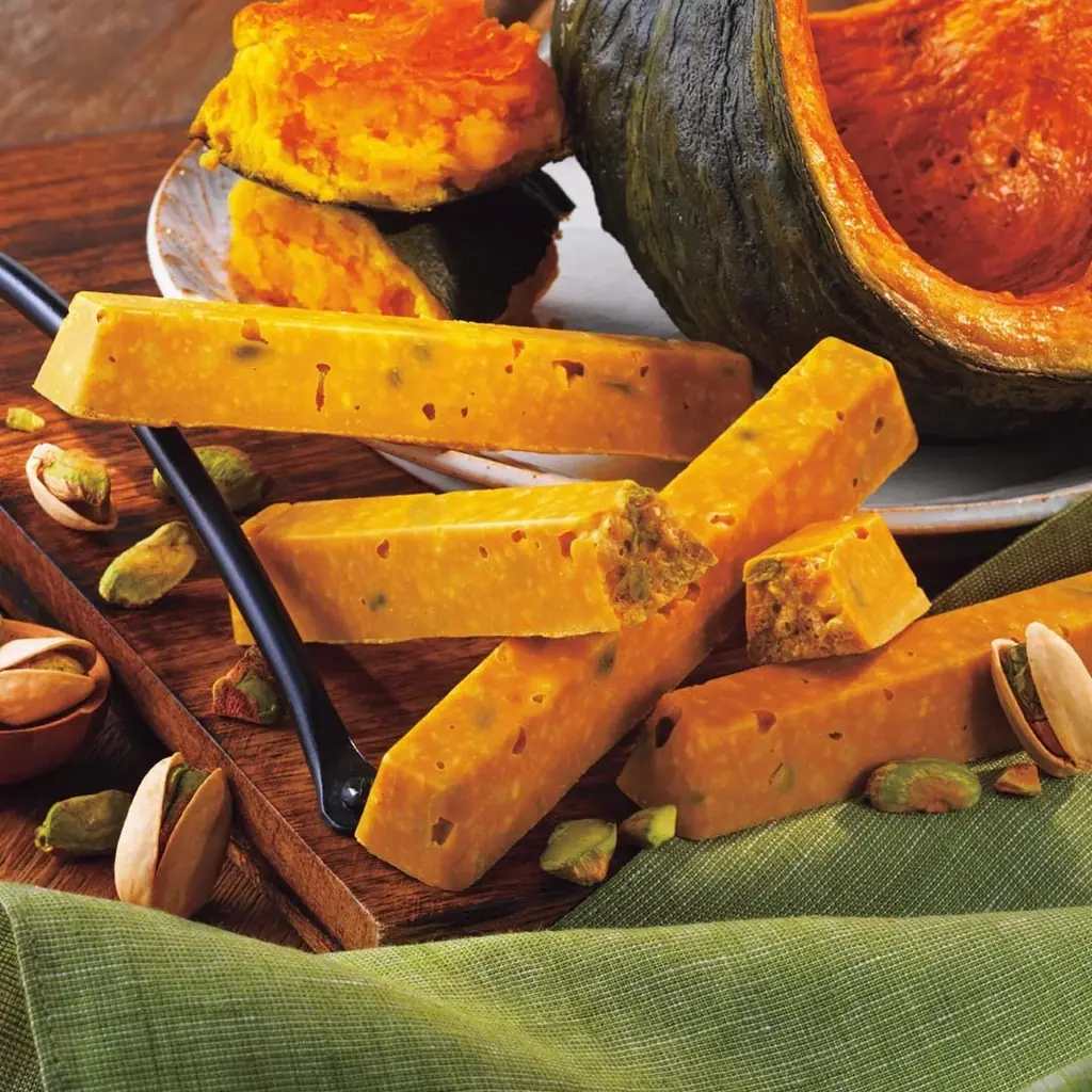 かぼちゃパウダーとカラメルシュガーパウダーを練り込んだチョコレートに、ローストピスタチオとパンプキンフレークを詰め、アーモンドパフやクッキークランチで食感をプラスした商品です。ほっこりとしたかぼちゃの風味とピスタチオの香ばしさが調和し、秋らしい味わいに仕上がっています。