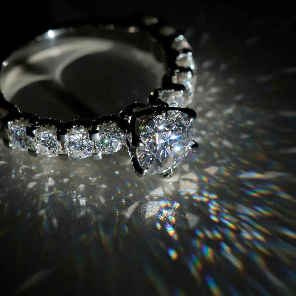 モアサナイトは、非常に高い分散度(ダイヤモンドの0.044に対してモアサナイトは0.104)を持ち、一般に「ダイヤモンドの約2.5倍輝く」と説明されることがあります。光学的なファイアと屈折率に優れ、眩い輝きが特徴の人工宝石です。