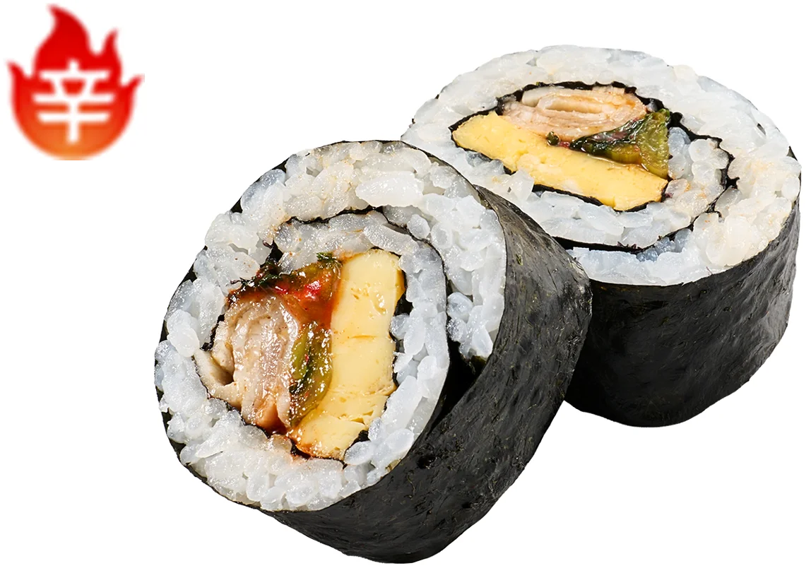 商品名は長野県産野沢菜キムチキンパ。ごま油の香りが特徴的なキンパ(韓国風の海苔巻き)で、長野県で馴染みのある野沢菜を使用しています。野沢菜の食感とピリ辛のキムチの組み合わせを基本に、豚塩カルビを加えることで旨みを強化し、さらにたまごを入れることでマイルドな味わいに整えています。