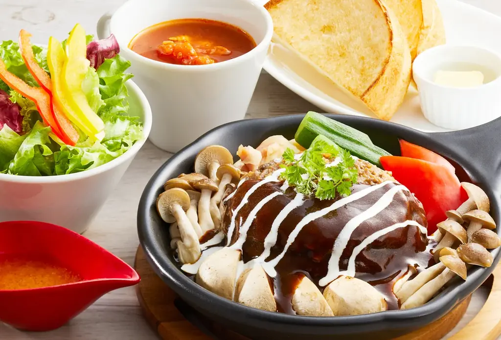 - 付け合わせと選択: パンはライスに変更可能。