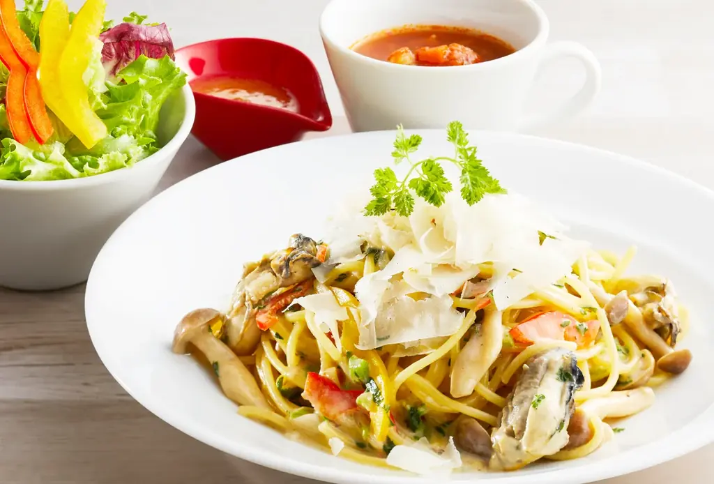 - 特徴: ポルチーニの香りが広がる濃厚なクリームソースに、旨みのある広島県産の牡蠣を組み合わせています。春菊をアクセントに加えた、もちもち食感の生パスタです。