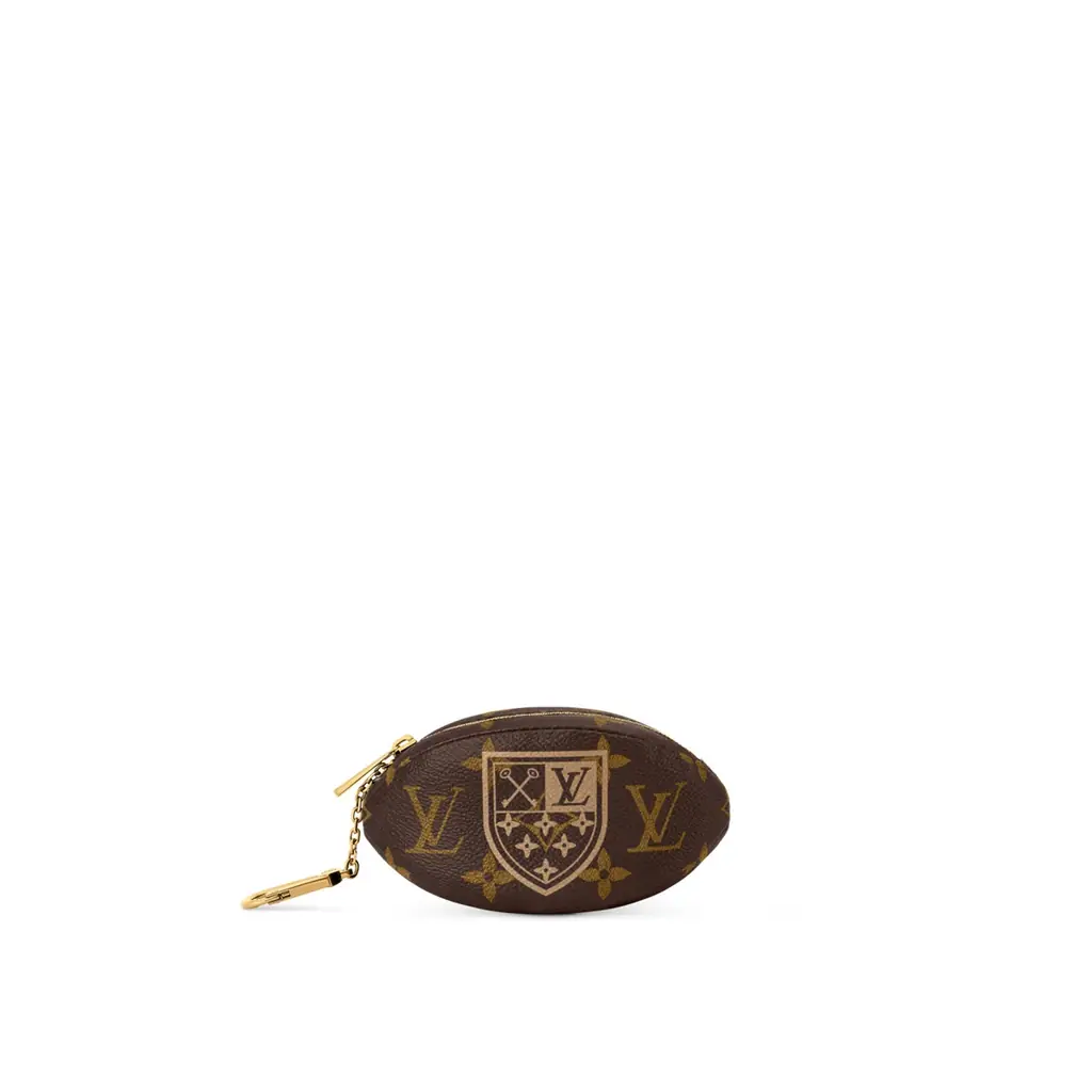 モノグラム・キャンバスにテキスタイルライニングとゴールドカラーの金具を組み合わせ、ミニチュアのラグビーボールを模したポシェットです。コートオブアームズのディテールが特徴で、カラビナスタイルのフックによりバッグや服に取り付けられます。