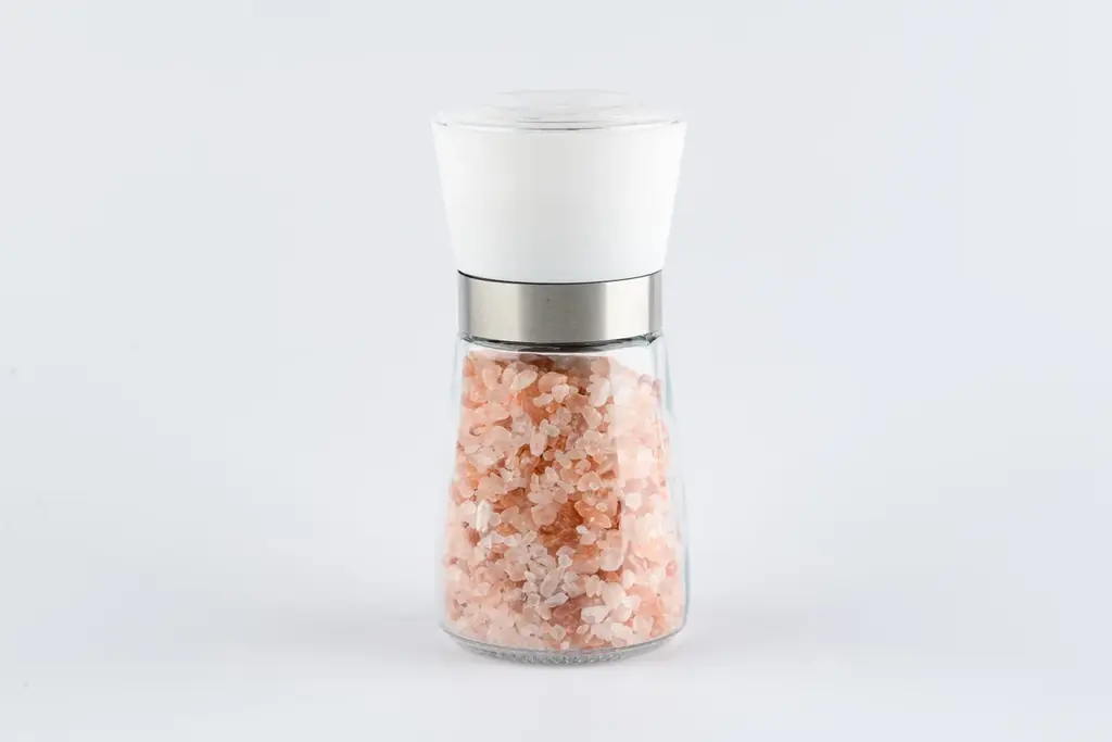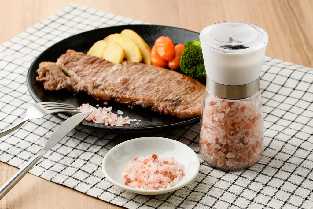 - 小粒(ミル用):ミル向けに調整されており、肉と合わせての使用はもちろん、熱中症対策タブレットやおつまみとしても人気。岩塩専用粉砕ミルは粒の大きさが無段階で調整可能で、持ちやすい瓶に入っている。