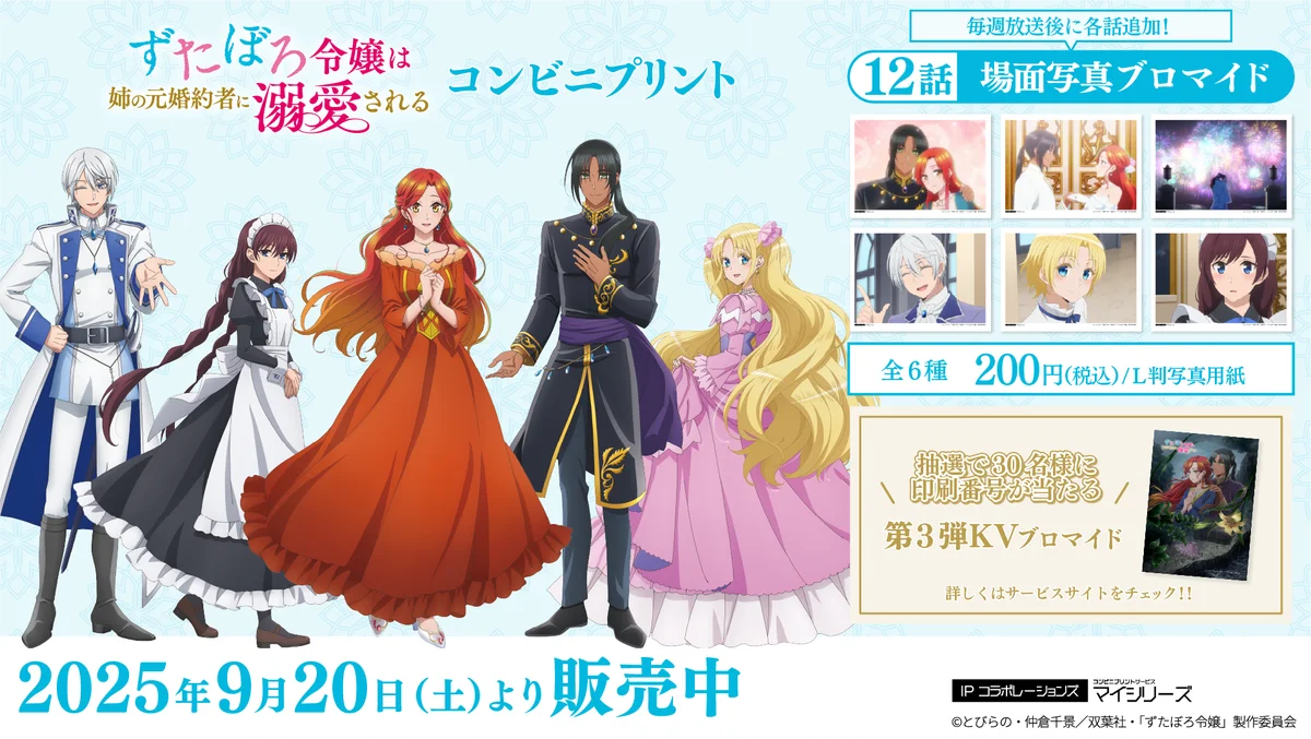 テレビアニメ「ずたぼろ令嬢は姉の元婚約者に溺愛される」の第12話にあたる場面写真が、2025年9月20日(土)14:30より専用サイトで提供開始されました。今回追加された場面写真は、番組本編の放送終了後にコンビニのマルチコピー機で現像可能な形式で配信されるもので、放送と同時に記録された決定的な一瞬を手元に残せる仕様になっています。