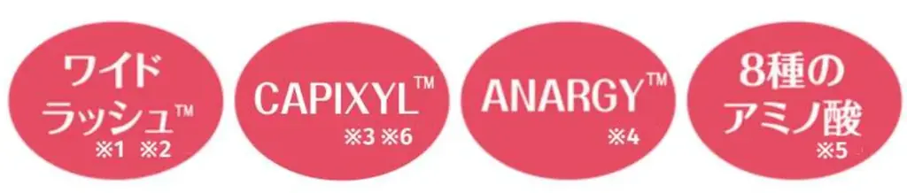 加えて、製品はワイドラッシュ(WIDELASH™)およびキャピキシル(CAPIXYL™)をはじめとする成分を採用している旨の表記があります。ワイドラッシュはSedermaの認可のもと使用されており、キャピキシルはLucas Meyer Cosmetics(Clariantのカナダ部門)からのライセンスに基づく使用です。プレスリリース内では、これらを含む複数の成分群を「うるおい成分」として区分しています。