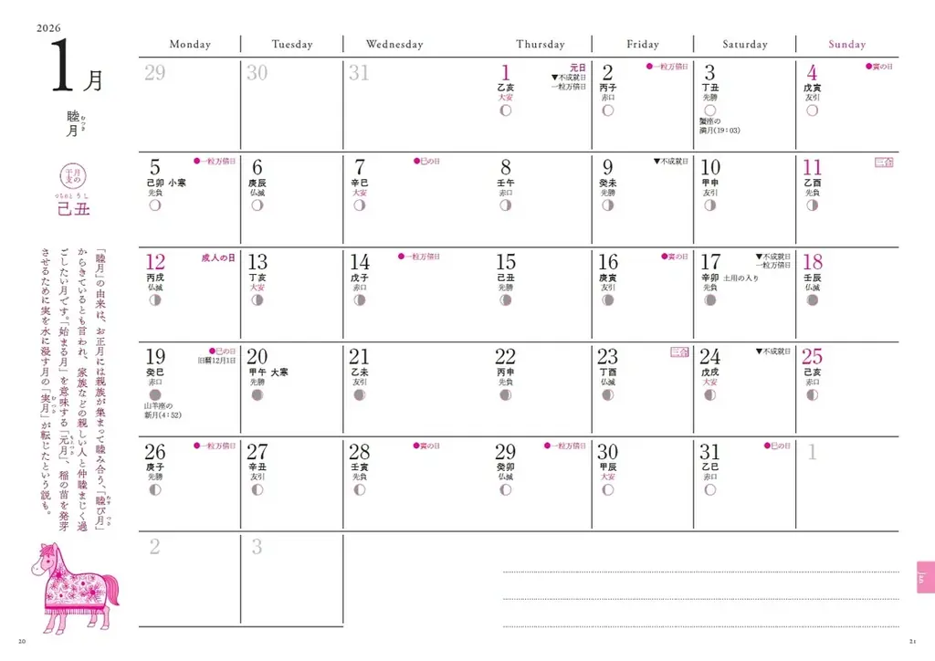 以上がプレスリリースに基づく『水晶玉子 開運・和暦ダイアリー2026』の内容と刊行概要の整理です。デザイン面では丙午の象徴性を反映し、実用面では暦情報と占い情報を組み合わせた構成になっているため、日常の予定管理と運気に関する判断の両面で参照できる一冊です。
