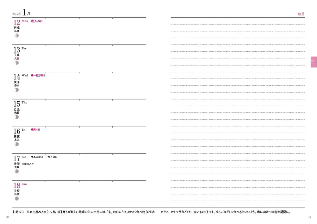 週間ページは、左側に週間の見開きカレンダー、下部に水晶玉子氏によるその週の暦に基づくアドバイスが配置されています。加えてフリースペースが充実しており、日記やメモ、アイデアの記録に十分な余白を確保しています。日記記入などの習慣化を助ける作りです。