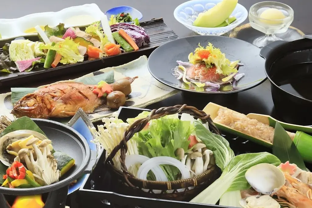食事は季節の旬を取り入れた会席料理が主体で、朝食は和朝食が提供されます。露天風呂付客室もあり、客室からの眺望を重視した滞在が可能です。