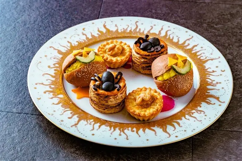 ブッフェレストラン「The Cafe」による「A Taste of the Harvest Buffet~世界の収穫祭」では、定番の秋メニューに加えてハロウィーンらしいポップでホラーな演出を施した料理とスイーツが並びます。料理名やスイーツ名も独創的で、見た目のインパクトによって写真映えも意識した構成です。
