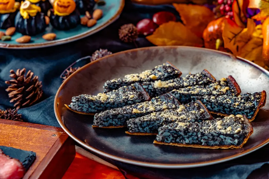 提供されるハロウィーンメニューの例として、飲食面ではかぼちゃのスープやグラタンの他に、遊び心ある漆黒のキッシュや真紅ソースの魚介のマリネなどがあります。スイーツは血の海チョコレートロールケーキ、ブラックパンプキンシュークリームなど、見た目と趣向を凝らしたラインナップです。