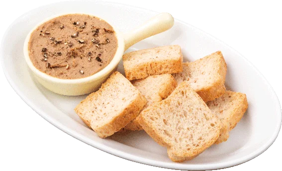 - レバーペーストのカナッペ 390円(税込429円): なめらかなレバーペーストを全粒粉のメルバトーストにのせた前菜。黒胡椒やスパイスで味にアクセントをつけ、酒の肴にも適した味わい。