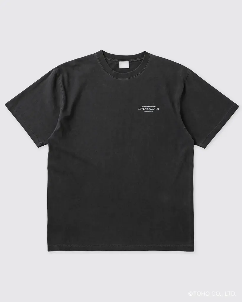 フロント胸元には英字タイトル『SEVEN SAMURAI』とクレジットをシンプルに配し、バックには三船敏郎演じる菊千代の印象的なワンカットを大胆にプリントしています。躍動感のあるビジュアルと控えめなロゴの組合せが特徴です。