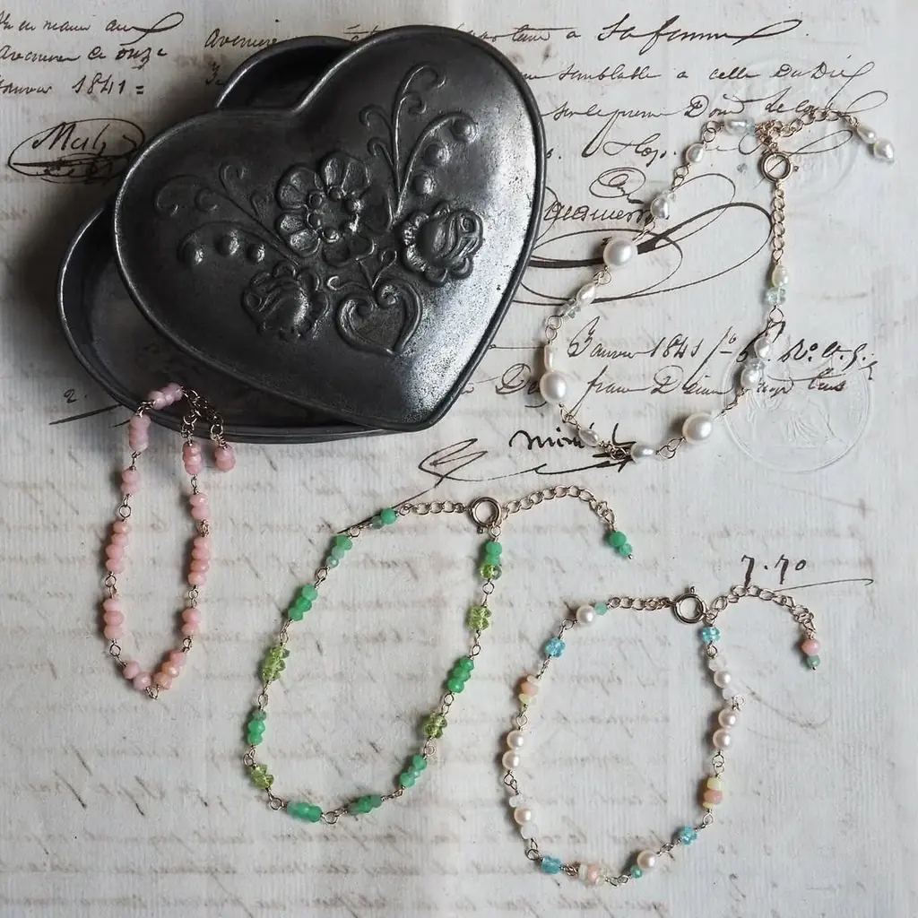 • シャンク巻きブレスレット:一本ずつ金線を石に巻き付ける“シャンク巻き”という技法を採用。ねじった部分は丁寧に溶接して固定することで、ハンドメイドの風合いと耐久性を両立させています。