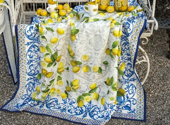 • 〈ルッカ〉 リネンファブリック テストゥーラ トスカーナ テレリーエ リネンテーブルクロス:税込41,800円(限定数 2) — 約160×230cm、麻100%、イタリア製。レモン柄でリビングを明るくするデザイン。
