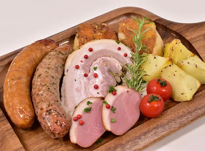 • 〈ビゴーテ〉 ビゴーテ肉盛りセット:1パック 税込2,160円(限定数 各日30) — ローストチキン、サルシッチャなど人気惣菜7種盛りのお買い得セット。
