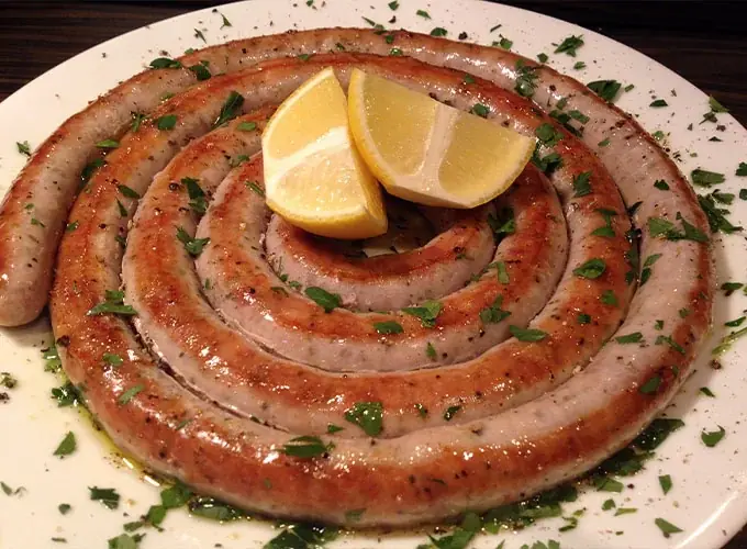• 〈ピッコロメルカ〉 ハーブ入りサルシッチャ オペラ:500g 税込2,800円 — 国産黒豚の粗挽きにローズマリーを加え渦巻き状にしたソーセージ。