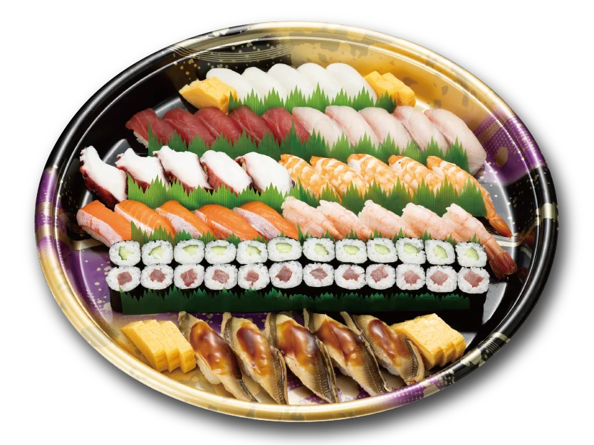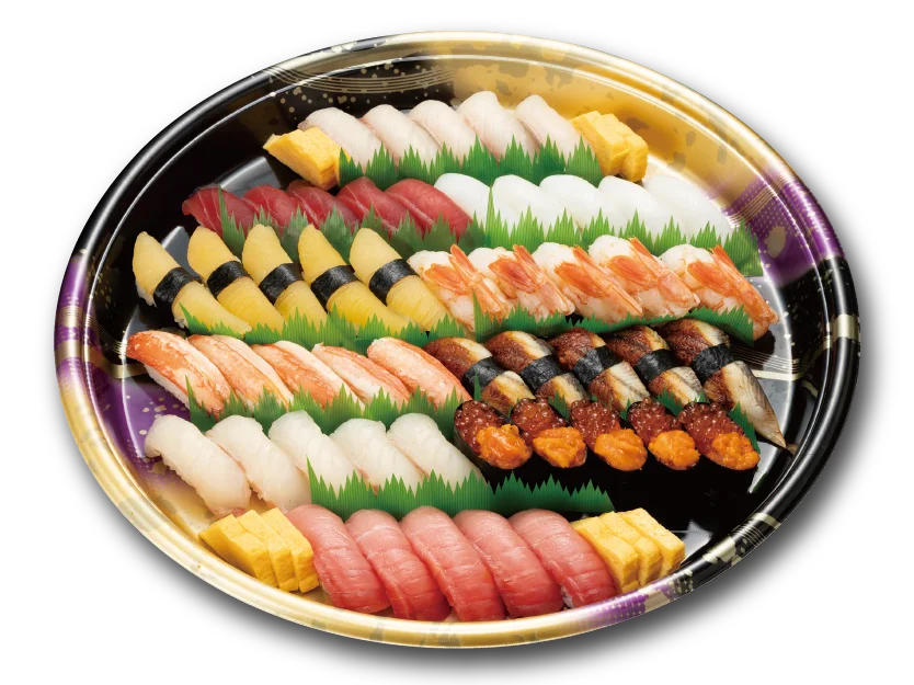 | 藤(ふじ) | かんぱち・本まぐろ赤身・いか・数の子・赤えび・かに・うなぎ・真鯛・うにいくら・本まぐろ中とろ・飾り玉子 | 15,120円 | 12,096円 | 9,072円 |