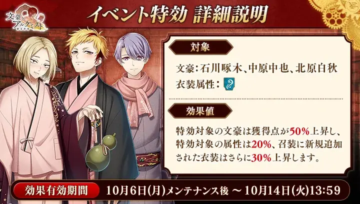 イベント開催に合わせ、限定召装『酒は天の美禄』が期間限定で登場します。この召装では、イベントで活躍する「中原中也」「石川啄木」「北原白秋」の新衣装が一定の確率で入手可能です。加えて、召装『金環ノ理』のラインナップも更新され、同じくイベントで有用な指環が入手できる仕様となっています。