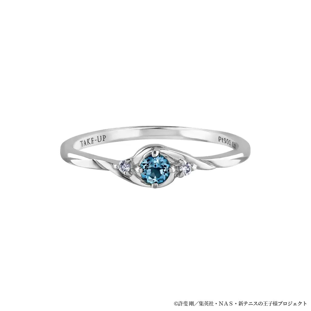 リング中央には、手塚の「冷静」「知性」を象徴する色として選ばれたロンドンブルートパーズを配置しています。深みのある落ち着いたブルーは、大人びた雰囲気とキャラクター性を兼ね備えており、センターの石が視線を引きつけます。