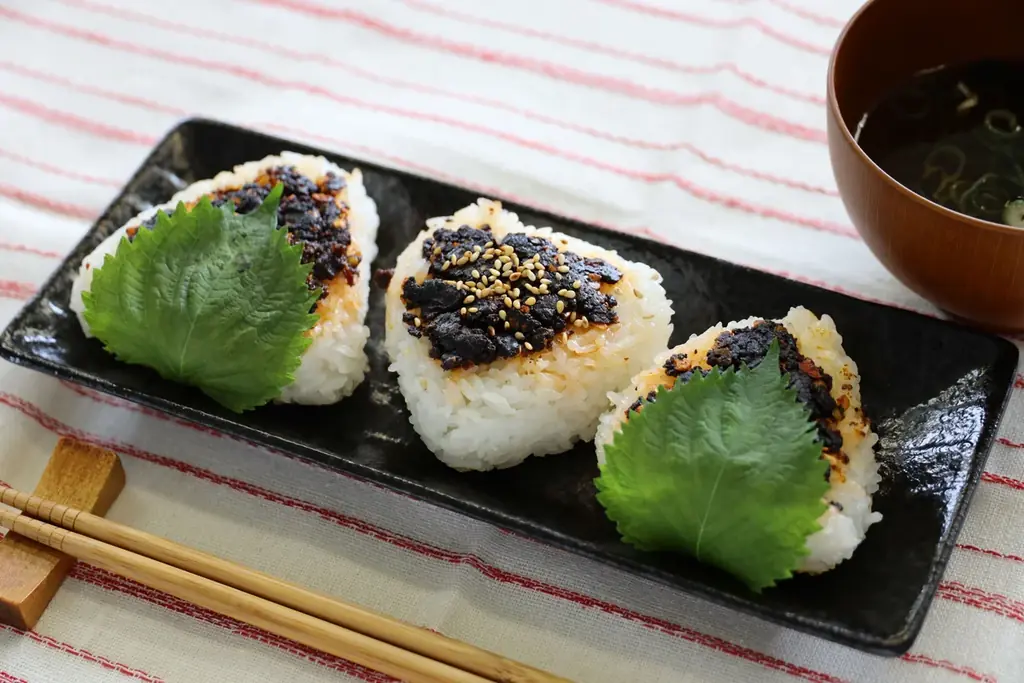 - 赤みそと食べるラー油を混ぜ合わせたものをおにぎりの表面に塗る。