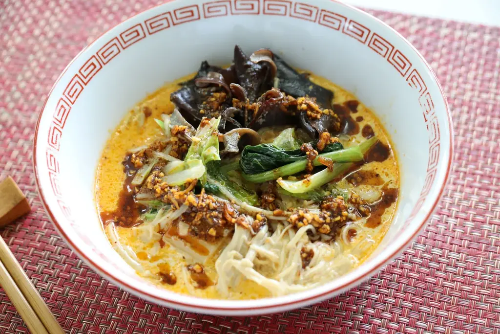 材料: 春雨 100g、調整豆乳 200ml、水 100ml、鶏がらスープの素 小さじ1、食べる麻辣油 大さじ1、具材はお好みで(白菜、えのき、小松菜、えび団子3個、きくらげ15gなど)