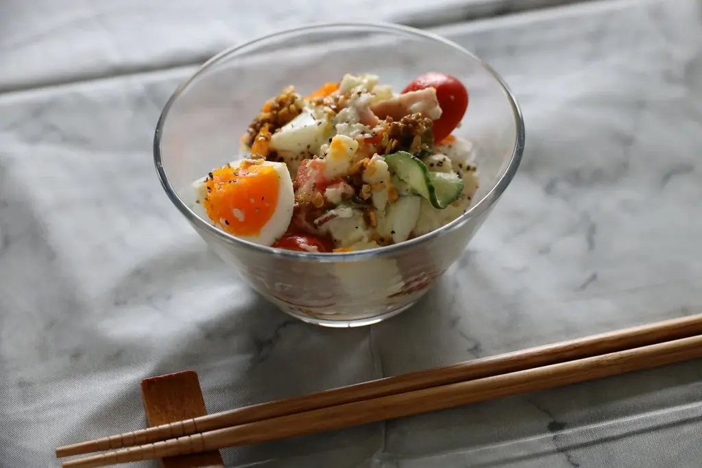 - ポテトサラダにトマト、ゆで卵、食べるオリーブオイル、ブラックペッパーを加えて混ぜる。