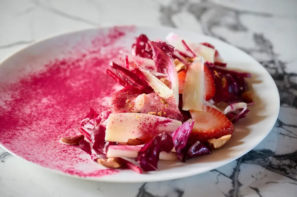 前菜(Hors d’oeuvre)は「ルビーサラダ」。トレビス、ビーツ、ブッラータチーズに旬のイチゴや鴨ハムを合わせ、ビネグレットで甘酸っぱく仕上げた皿です。赤い色合いがクリスマスを連想させ、具だくさんのサラダとして満足感があります。