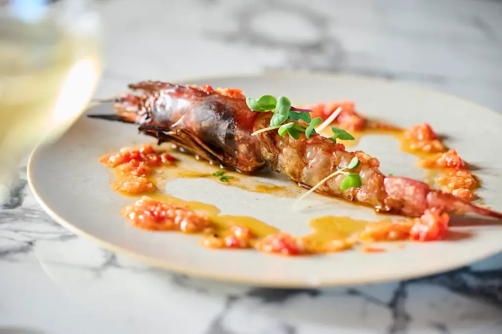 魚料理(Poisson)は「ガーリックシュリンプ」。一本の海老を炭火で丁寧に焼き、ガーリックシュリンプに見立てた皿で、ナンプラーを使用したソースによりエスニックなニュアンスを加えています。炭火調理の香ばしさとソースの風味が特徴です。