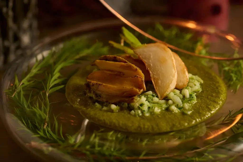 シェフのスペシャリテは鮑と蕪(カブ)を余すことなく使用したリゾットです。アワビとカブは薪焼きにし、余ったカブの茎はリゾットソースに活用。仕上げにスモークで香りを閉じ込め、濃厚なソースでまとめた一皿は、海の旨味と野菜の甘みの融合が意図されています。