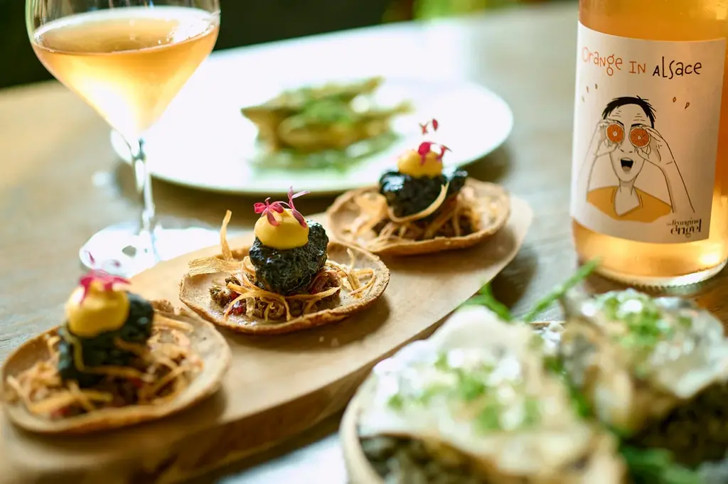 「Noël Course」は全6品で構成され、シェフの創造性が反映された前菜からメインまでが薪火と日本の旬の食材を組み合わせて提供されます。コースはフィンガーフードの盛り合わせから始まり、魚料理、スペシャリテ、メインの肉料理へと進行します。