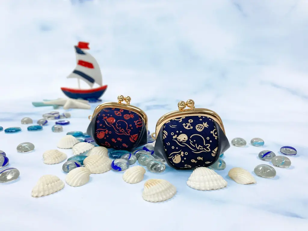 - 海柄 印伝(POPUP限定カラー:紺革×赤漆) — クジラの親子が描かれたオリジナル人気柄に、本POPUPショップ限定配色(紺革×赤漆)が登場。形や用途の異なる小物類を中心に展開。