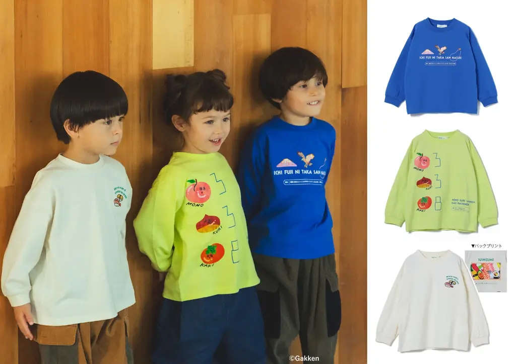 | BEAMS mini×学研の辞典 | ことわざ・慣用句 ロングスリーブTシャツ(デザイン:「一富士二たか三なすび」「桃くり三年柿八年」「すし詰め」)サイズ100〜150cm | 各3,190円 | 2025年9月25日 | BEAMS 公式商品ページ |
