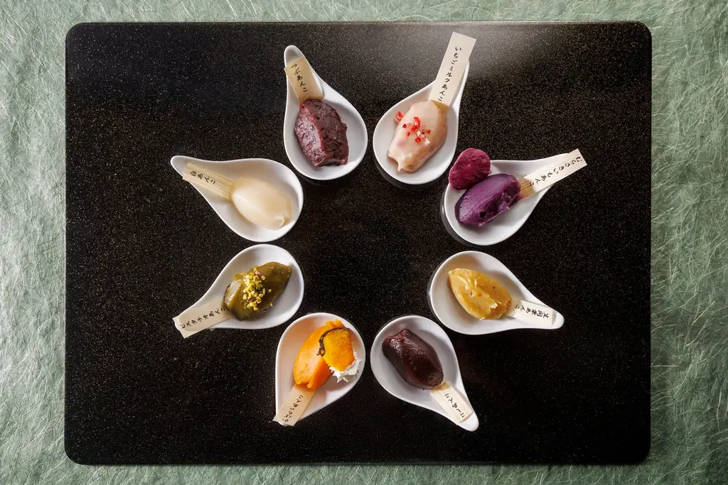 名称にある「餡くらべ」は二重の意味を持ちます。第一に文字どおり「あんこを食べ比べる」ことを指し、本アフタヌーンティーではメインに8種のあんこを据え、来訪者が各あんこの味わいを比較しながら楽しめる構成になっています。比較を通じて好みを特定し、どら焼きや大福、羊羹などへの横展開を楽しむ入口とする趣旨です。