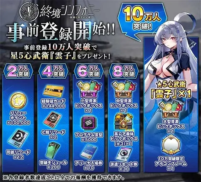 5. 10万人突破:☆5心武衛「雲子」×1、10万突破限定アイコンフレーム×1、大型資源ピックボックス×1