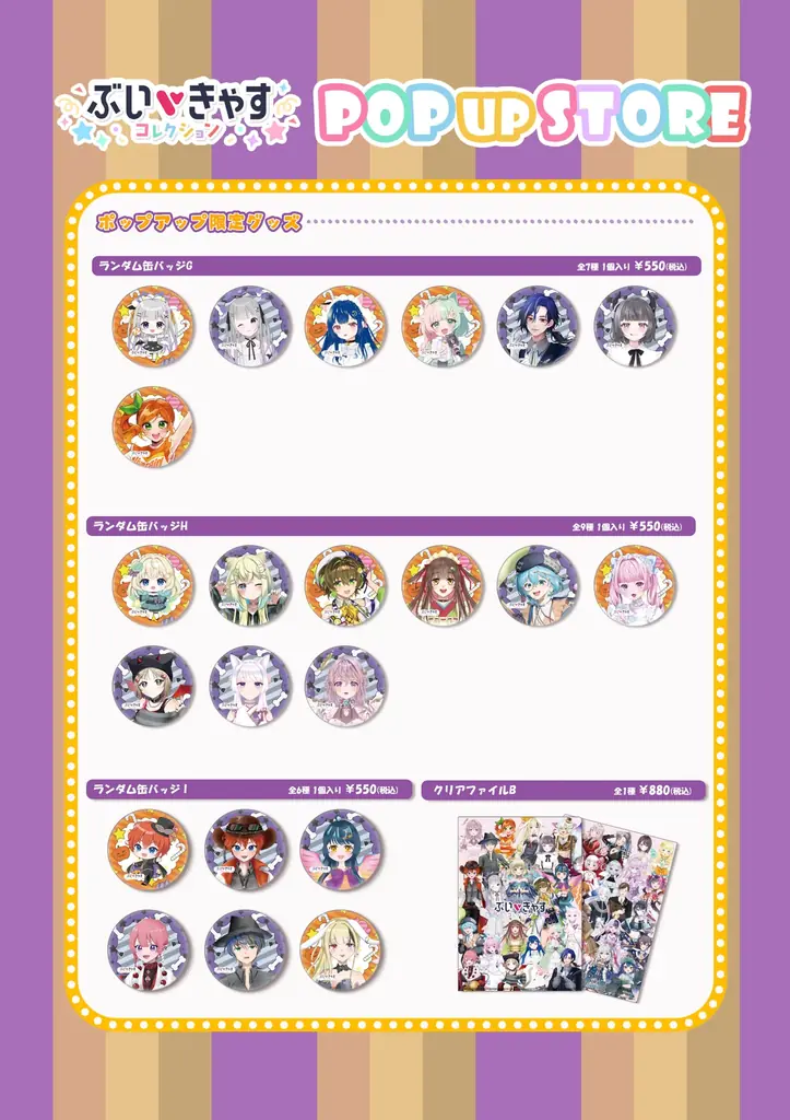 グッズ主な内容 クリアファイル、アクリルキーホルダー、メタルプレート、タオルハンカチ、ステッカー、タペストリー、缶ジュース、ランダムトレーディングカード、ランダム缶バッジ