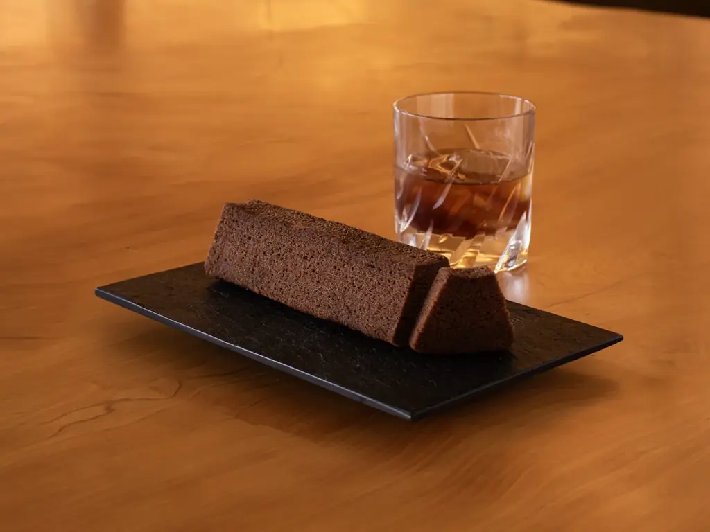ほろよいウイスキーばあむ 3,024円 製造日を含む46日 2025年11月11日(火)より通年 atelier京ばあむ1階「メインショップ」 特別栽培米コシヒカリ由来の生の米粉、カカオマス70%のビターチョコを使用したショコラ生地を国産シングルモルトウイスキーで仕込んだシロップに浸し、熟成させた大人向けのバームクーヘン(洋酒入りのため注意表示あり)。