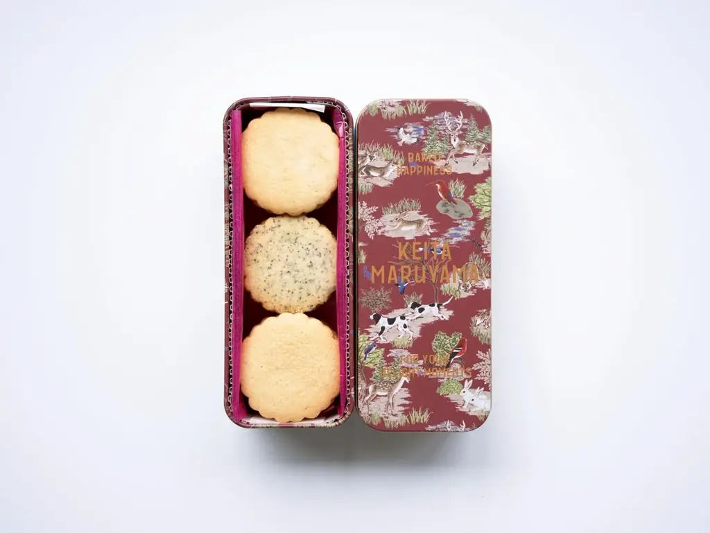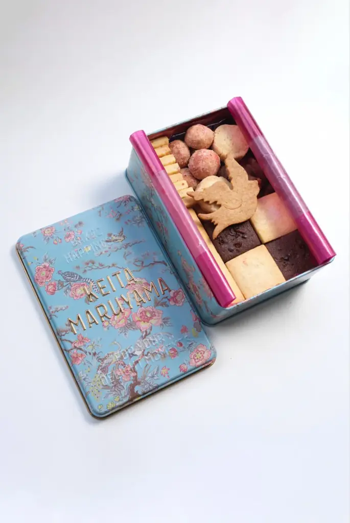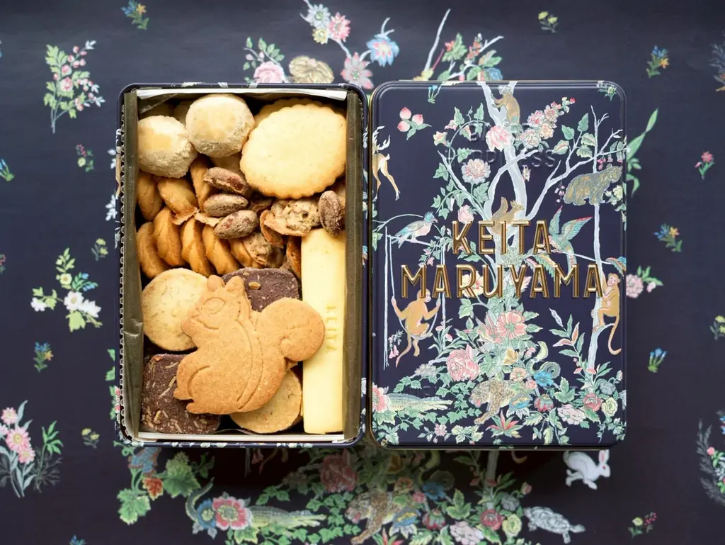説明:「KEITA MARUYAMA」の花鳥柄をあしらった代表的なデザイン。中はレモン風味のバタークッキーや香ばしいチョコレートクッキーなど、8種類の異なるクッキーを詰め合わせた構成で、見た目のバリエーションも豊かです。