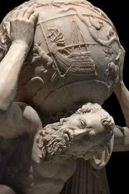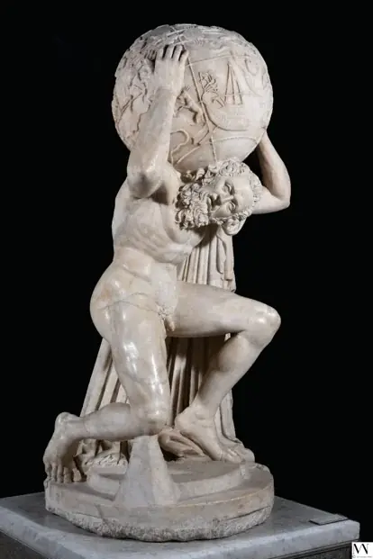 西暦2世紀/大理石。高さ193cm、直径102cm。ナポリ国立考古学博物館(National Archaeological Museum of Naples, MANN)より貸与。万博でアジア初公開された作品で、古代ギリシア神話の巨人アトラスが重い天球を抱える姿を表す。天球には精緻に星座や黄道十二宮が刻まれており、古代彫刻の最高傑作と称される。