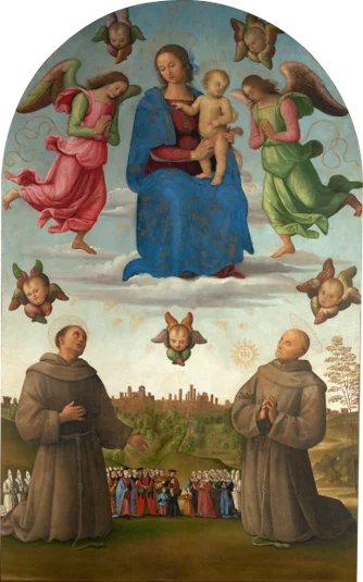 - ピエトロ・ヴァンヌッチ(ペルジーノ)《正義の旗―聖フランチェスコ、シエナの聖ベルナルディーノ、祈る正義兄弟会の会員たちのいる聖母子と天使》