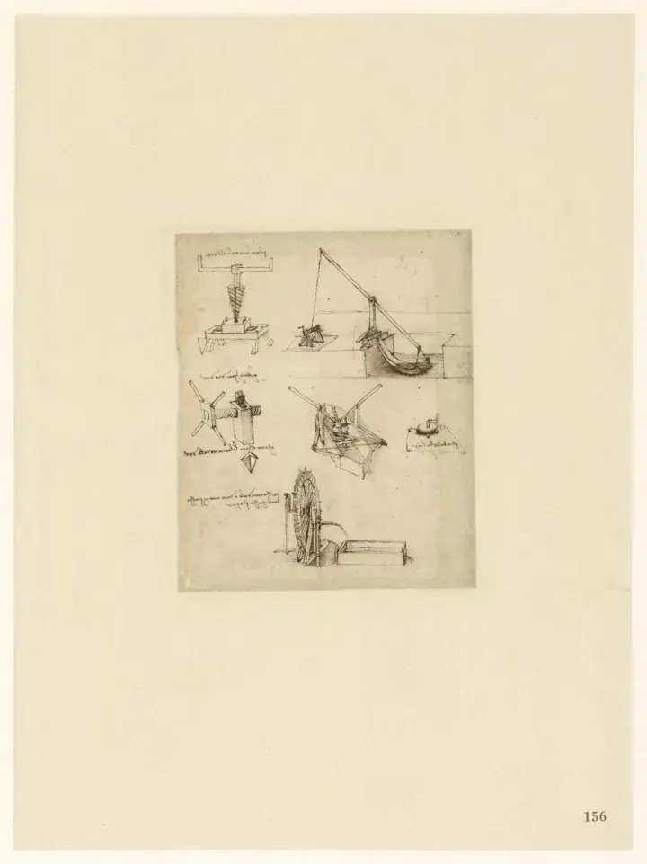 第156紙葉 表:《水を汲み上げ、ネジを切る装置》 制作年1480-1482年頃/紙にペン、インク、水彩 255×210 mm。掲載・複写の権利表記:© Veneranda Biblioteca Ambrosiana/Metis e Mida Informatica /Mondadori Portfolio.
