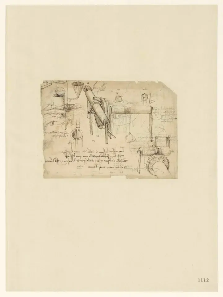 第1112紙葉 表:《巻き上げ機と油圧ポンプ》 制作年1478年頃/紙にペン、インク 203×286 mm。同上の権利表記あり。