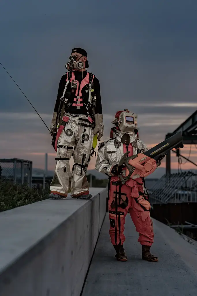 また、作品に付随する上衣装《デブリ・フィッシャー》は ELIOS による制作。かつて海で魚を獲っていた漁師たちが、未来では海洋デブリの回収に従事するという想定のもと、海を浄化する者としての新しい一次産業従事者像を表現する衣装である。ここでは、価値を失った漂流物を価値あるものへと変換する作業者の役割が物語的に示されている。