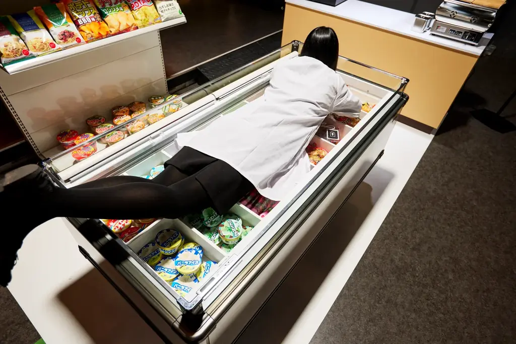 - 本物のアイスケースの上に寝そべる体験型展示:冷たい質感や視覚的ギミックを利用した体験で、通常の展示とは異なる非日常性を演出する。