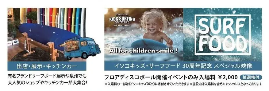 本イベントはISOKOKIDSとWHATAWONのコラボレーションによって実現され、来場者はサーフィン、音楽、アート、フードなど多彩なカルチャーを通じて、まるで“波に乗る”ような一日を体験できます。音・光・映像が連動する演出や、地域に根ざした出店・展示が会場を彩ります。