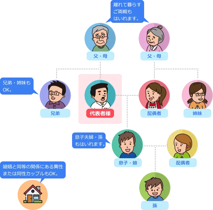 - 利用対象は代表者のご家族で、2親等以内が目安。
