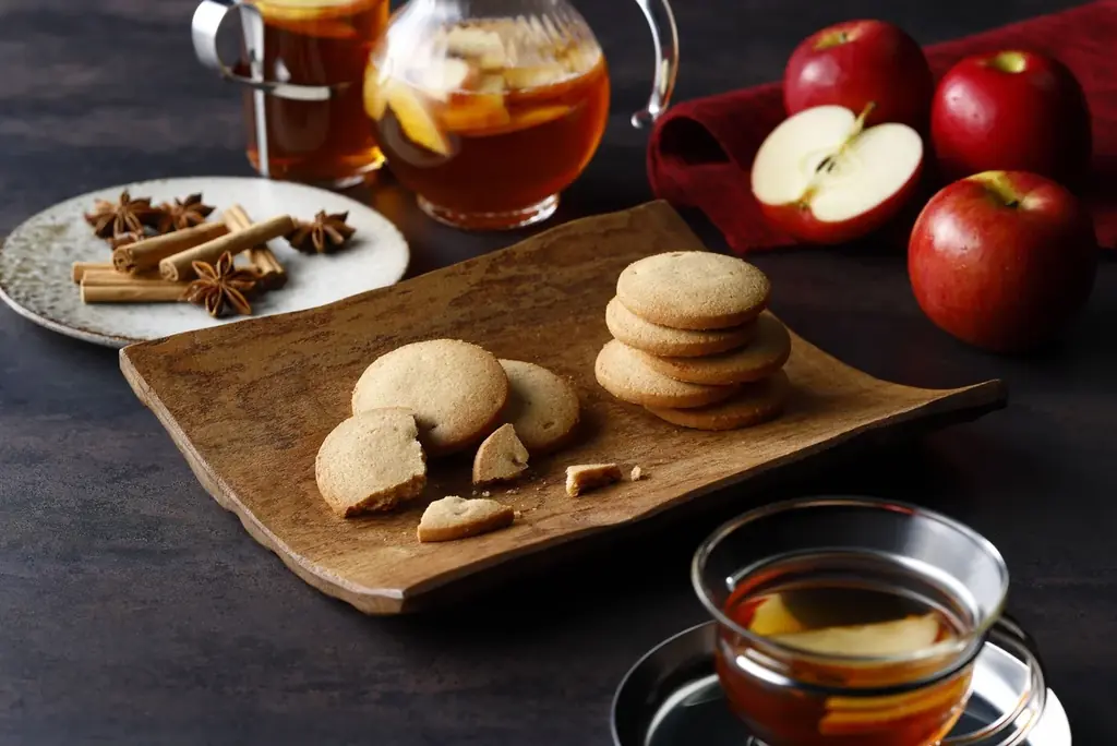 続いて、2025年11月5日(水)から販売される『御用邸アップルチーズクッキー』は、パルメザンチーズを主体にした濃厚な生地に、数種類のスパイスと細かく刻んだりんごの砂糖漬けを合わせて焼き上げたサクほろのクッキーです。ほのかなスパイスの香りとパルメザンのコク、りんごの甘酸っぱさの調和が意図されています。