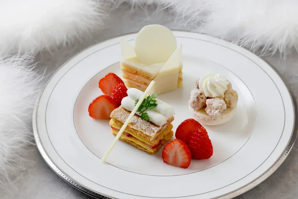 - いちごのミルフィーユ:みずみずしいいちごをサンドし、フレッシュいちごを添えています。