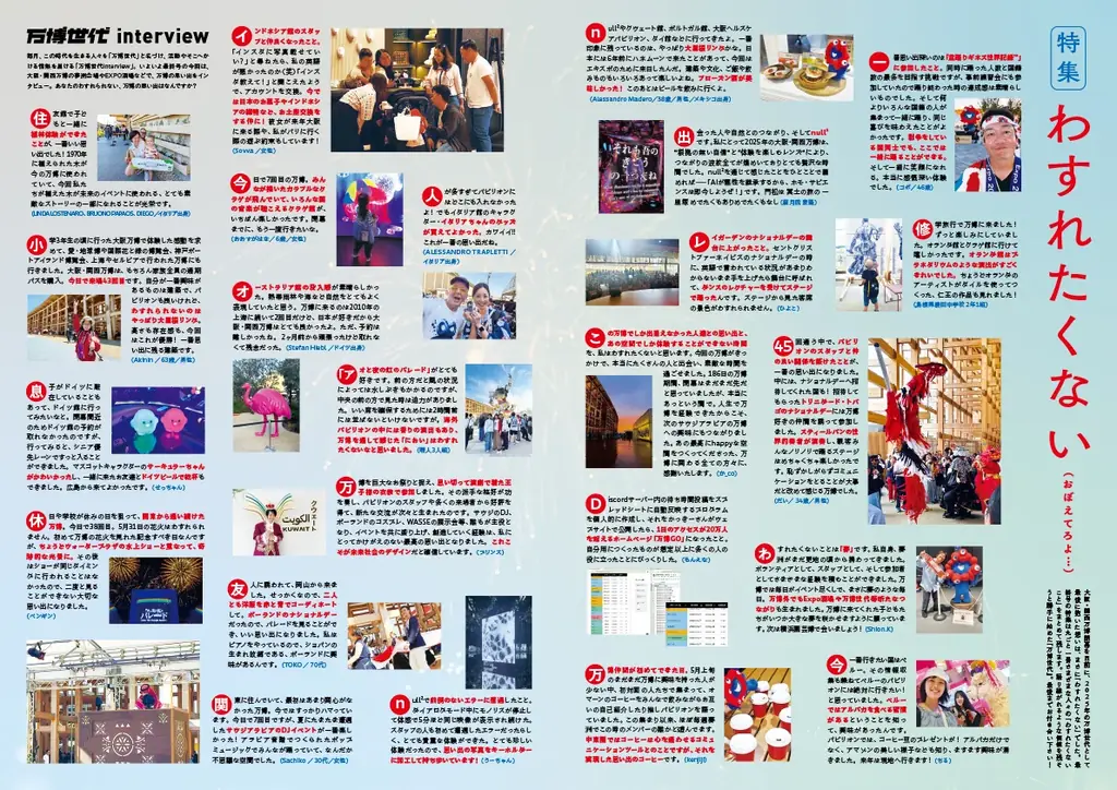 夢洲会場やEXPO酒場に訪れた24名の一般来場者へ行ったインタビューを中心に、それぞれのわすれられない万博の思い出を収録しています。来場者の視点から見た体験談は、多様な年代・立場の声を集めることで、万博の記憶の幅を伝えます。